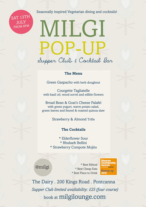 We have an exciting Supper Club date not to be missed. Saturday 13th July we will be popping up for one night only at The Dairy, Pontcanna for an evening of food and drink made using only Organic, Seasonal and hand-picked produce. Booking essential - limited availability.